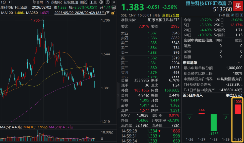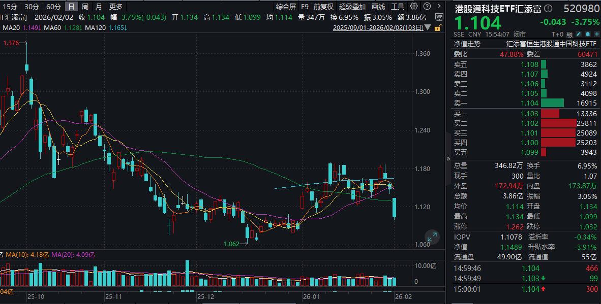今日(2.2),受市场情绪影响,港股科技再度深度回调,100%纯度的港股通科技ETF汇添富(520980)收跌3.75%,连续第三日大幅下挫,全天成交额近4亿元!