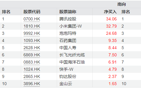 南向资金持续涌入港股。近七日以来,腾讯控股净买入超34亿港元位居榜首,小米集团-W、快手-W、金山云也均位居净买入榜前十。