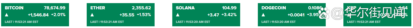 比特币涨1.94%,暂报78626.30美元;以太坊涨1.45%,暂报2353.70美元。