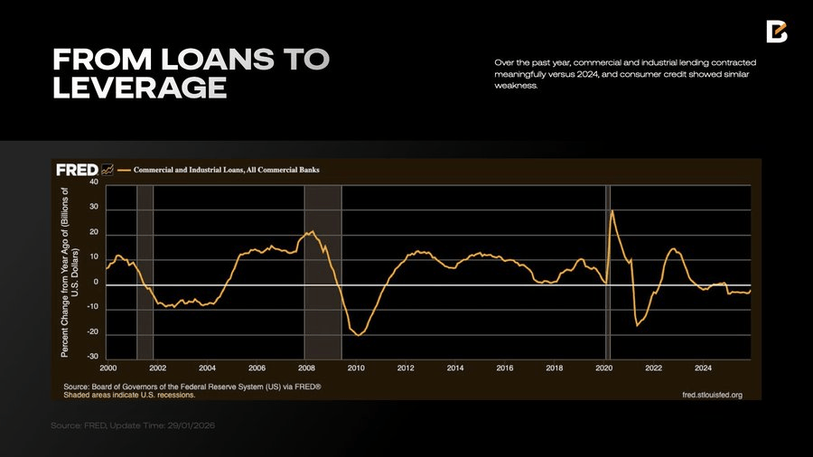 信贷收缩: 过去一年,商业和工业贷款较 2024 年显著萎缩,消费信贷同样疲软。