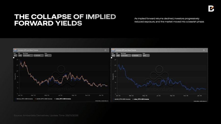高昂的融资成本直接限制了头寸配置。当一种风险资产的隐含远期回报率跌破国债收益率时,长期持有该资产便失去了吸引力。加密货币就是一个教科书式的例子:随着隐含回报率的下降,投资者逐步减少敞口,导致市场不可避免地转入熊市阶段。