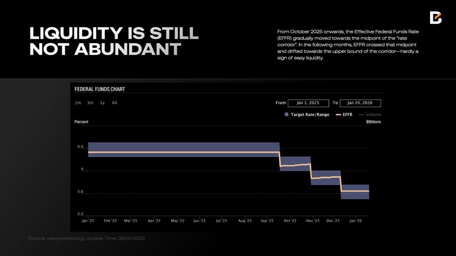 事实上,2025 年 9 月至 12 月,出于对劳动力市场的担忧,美联储确实实施了三次“防御性”降息,并宣布结束量化紧缩(QT)。但这并未带来投资者期盼的“流动性洪流”。从 10 月起,有效联邦基金利率(EFFR)逐渐向“利率走廊”中点移动,随后甚至越过中点漂移至走廊上限 — — 这绝非流动性宽松的迹象。
