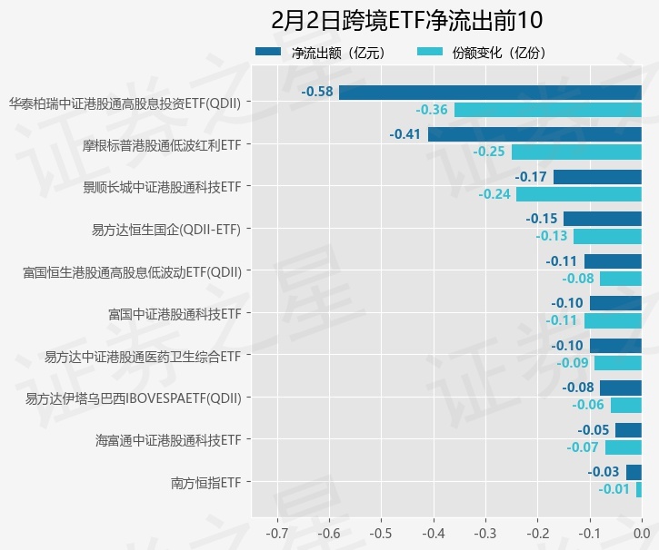 当日有16只跨境ETF基金出现资金净流出,其中净流出排首位的是华泰柏瑞中证港股通高股息投资ETF(QDII)(513530),份额减少了3550.0万份,净流出额为5773.29万元。