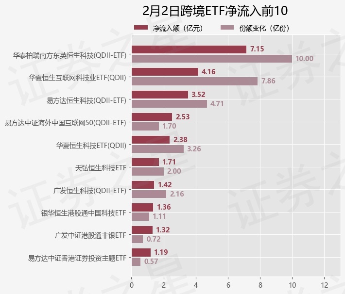 当日有47只跨境ETF基金出现资金净流入,其中净流入排首位的是华泰柏瑞南方东英恒生科技(QDII-ETF)(513130),份额增加了10.0亿份,净流入额为7.15亿元。