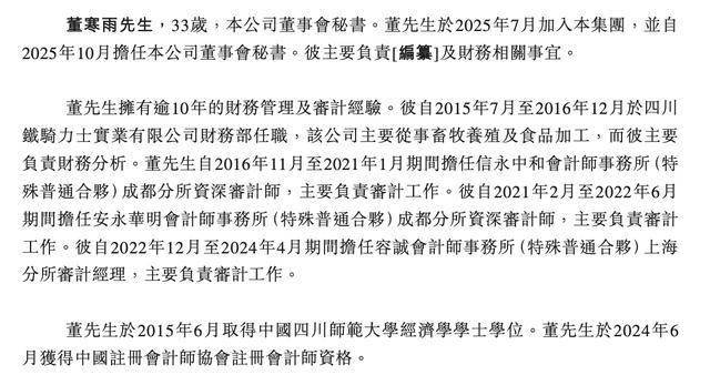 另外,董寒雨,33岁,公司董事会秘书。董寒雨于2025年7月加入集团,并自2025年10月担任公司董事会秘书。