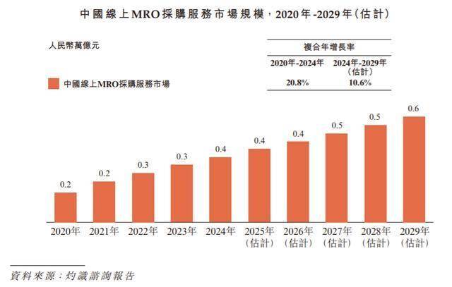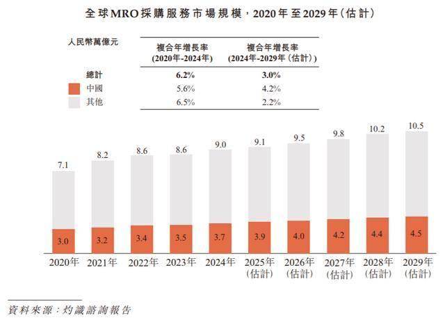 按商品交易总额计,全球的MRO采购服务市场由2020年的人民币7.1万亿元增至2024年的人民币9.0万亿元,复合年增长率为6.2%,并预计将以3.0%的复合年增长率由2024年进一步增至2029年的人民币10.5万亿元。就商品交易总额而言,中国MRO采购服务市场的规模从2020年的人民币3.0万亿元增至2024年的人民币3.7万亿元,复合年增长率为5.6%。预计到2029年将达到人民币4.5万亿元,复合年增长率为4.2%。