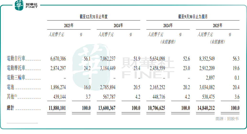 从收入结构看,电动自行车是绝对主力,2025年前三季度贡献56.3%的收入(83.53亿元);电池作为核心配件表现亮眼,收入占比达20.4%(30.34亿元),成为重要增长引擎;电动摩托车则贡献19.6%的收入(29.12亿元)。