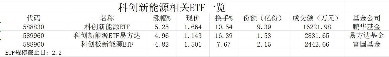 点评:科创新能源ETF(588830)今日上午涨幅达到5.25%,份额为9.39亿份,半日成交金额为1.62亿元,其追踪的是上证科创板新能源指数。追踪该指数的ETF还有科创新能源ETF易方达(589960)和科创板新能源ETF(588960),上述两只ETF半日涨幅也接近5%。
