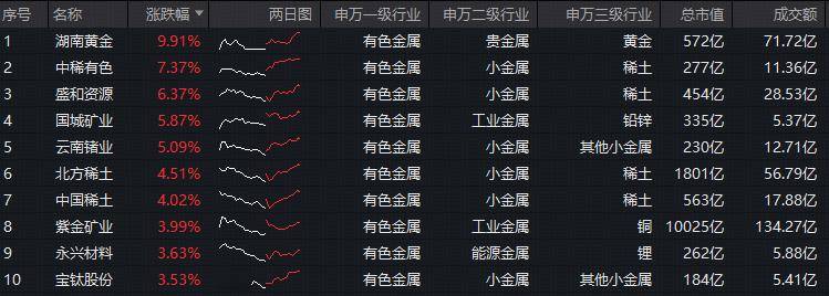 成份股方面,湖南黄金触板,中稀有色涨超7%,盛和资源涨逾6%,国城矿业、云南锗业、北方稀土、中国稀土等个股大幅跟涨。权重股方面,紫金矿业涨超4%,洛阳钼业涨逾3%,中国铝业涨逾2%。