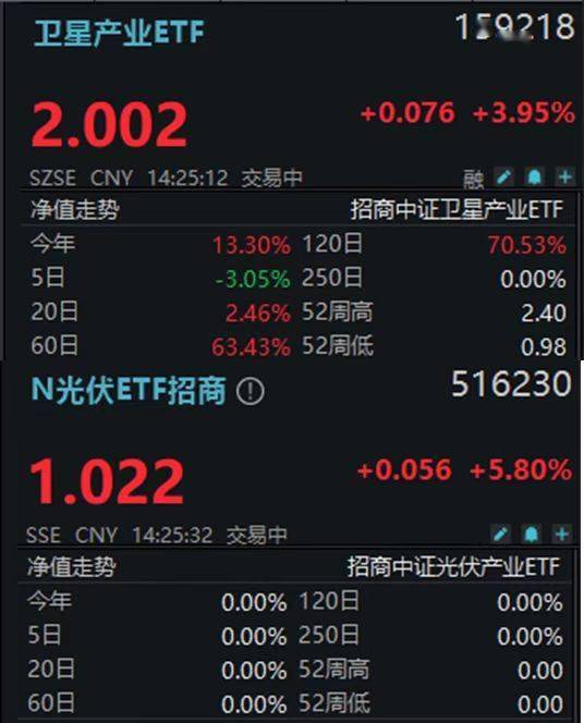 2月3日,“太空光伏”概念持续发酵!截至14时23分,卫星产业ETF(159218)、N光伏ETF招商(516230)分别涨4.15%、5.80%。