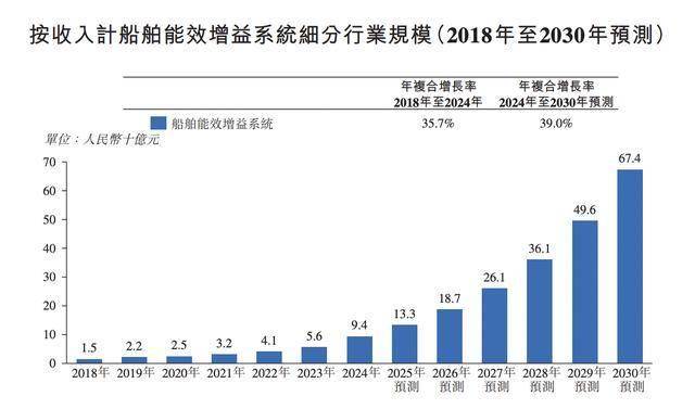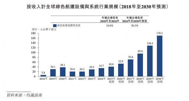 全球绿色航运设备与系统行业规模按收入计在过去几年中呈现快速增长态势,市场规模从2018年的人民币58亿元增加至2024年的人民币347亿元,年复合增长率达34.6%。展望未来,市场有望进一步扩张,预计到2030年市场规模将达到人民币1,702亿元,从2024年至2030年的年复合增长率为30.3%。此强劲增长乃基于日趋严格的脱碳法规、加快的船队更新需求,以及船东对燃油效率、运营优化及长期资产表现的日益关注。