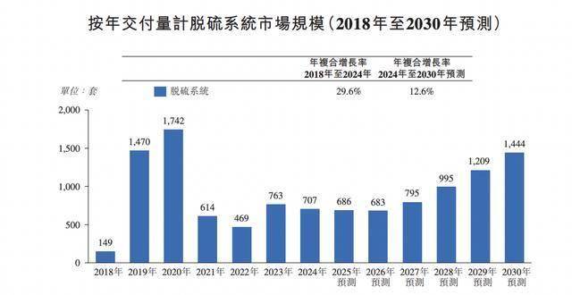 随着全球对实现净零排放的关注度日益加强,预计到2030年,该细分行业规模将达到人民币360亿元,2024年至2030年预测年复合增长率为17.6%。作为船舶尾气排放控制及净化系统细分行业中体量最大的部件,船用脱硫系统年交付量由2018年的149套增长至2024年的707套,预计到2030年将进一步攀升至1,444套。