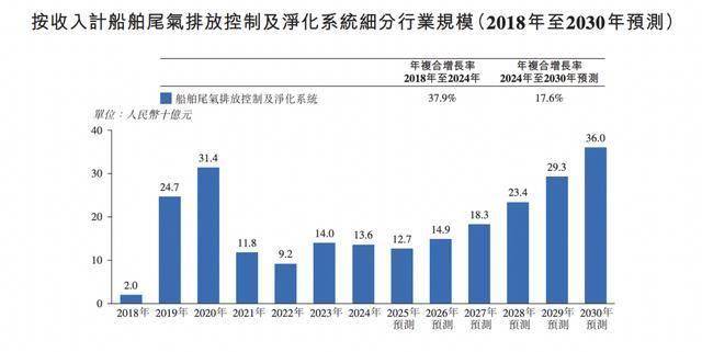 船舶尾气排放控制及净化系统细分行业规模按收入计从2018年的人民币20亿元增长到2020年的人民币314亿元,主要受国际海事组织2020年限硫令驱动,该限令促使船东安装脱硫系统以节省燃料成本。在合规安装高峰期之后,船用脱硫系统安装量趋于稳定,2024年该板块市场规模回落至人民币136亿元,2018-2024年期间年复合增长率为37.9%。预计市场将在2026年迎来新一轮增长,归因于国际海事组织将净零框架的实施节点推迟至2026年,以及对碳捕集技术等多元化排放控制设备及系统的需求持续增长。