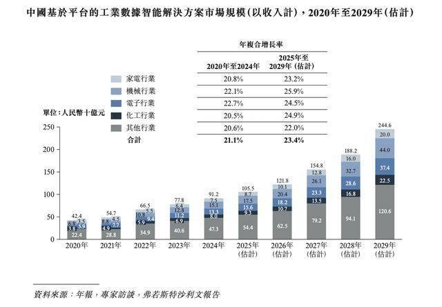 随着传统工业智能化转型进程加快、工业大数据分析技术的成熟落地,以及工业场景对数据价值挖掘需求的持续攀升,中国基于平台的工业数据智能解决方案市场呈现高速扩张态势。市场规模由2020年的424亿元增长至2024年的912亿元,2020至2024年复合年增长率为21.1%;预计将由2025年的1,055亿元增长至2029年的2,446亿元,2025年至2029年复合年增长率为23.4%。