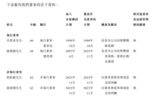 肖俊承,60岁,公司执行董事、董事长,主要负责公司的整体战略规划。他于1999年10月创办公司,并自此参与公司的管理及运营工作。他担任公司的核心管理职务,包括执行董事、董事长、总经理。