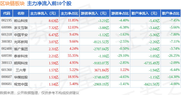 从资金流向上来看,当日区块链板块主力资金净流入13.08亿元,游资资金净流出22.65亿元,散户资金净流入9.57亿元。区块链板块个股资金流向见下表: