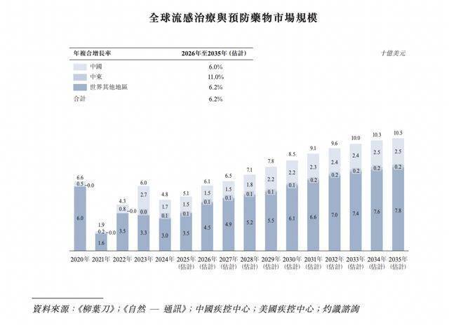 流感药物市场包括抗病毒治疗(用于治疗和预防用途)及退热剂等对症治疗药物。据估计,2024年全球流感治疗与预防药物市场规模达到48亿美元,其中中国贡献17亿美元,中东地区贡献0.6亿美元,世界其他地区贡献30亿美元。预计到2035年,市场规模将达到105亿美元,其中中国贡献25亿美元,中东地区贡献2.2亿美元,世界其他地区贡献78亿美元。