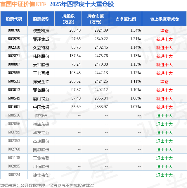 根据2025基金年报公募基金重仓股数据,重仓该股的公募基金共4家,其中持有数量最多的公募基金为富国基金的富国中证价值ETF。富国中证价值ETF目前规模为21.86亿元,最新净值1.212(2月2日),较上一交易日下跌3.16%,近一年上涨25.53%。该公募基金现任基金经理为曹璐迪 苏华清。曹璐迪在任的基金产品包括:富国中证价值ETF联接A,管理时间为2020年5月20日至今,期间收益率为120.46%;富国创业板ETF,管理时间为2020年8月6日至今,期间收益率为15.87%;富国中证科创创业50ETF,管理时间为2021年6月29日至今,期间收益率为-3.85%。苏华清在任的基金产品包括:富国深证50ETF,管理时间为2023年11月30日至今,期间收益率为48.67%;富国深证50ETF发起式联接A,管理时间为2024年1月23日至今,期间收益率为51.88%;富国中证A50ETF,管理时间为2024年3月7日至今,期间收益率为34.45%;富国中证A50ETF发起式联接A,管理时间为2024年4月23日至今,期间收益率为29.64%。