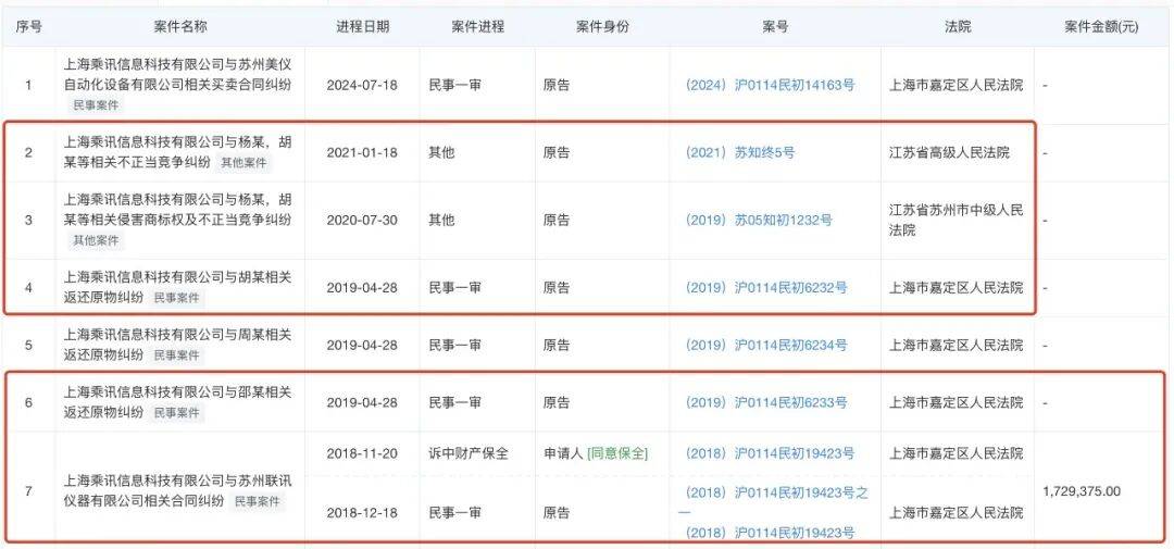 「创业最前线」注意到,胡海洋与前东家上海乘讯存在不少纠纷。公开资料显示,2018年以来,上海乘讯以商标纠纷、返还原物纠纷、合同纠纷、民间借贷等理由,将联讯仪器、胡海洋、邵毅男等主体告上法庭。