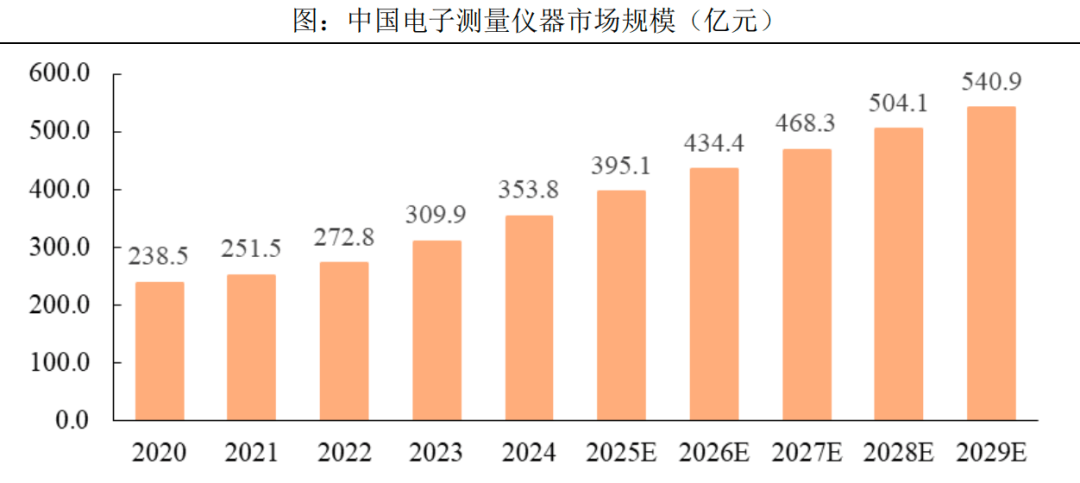 根据Frost&Sullivan数据,中国电子测量仪器市场规模将由2020年的238.5亿元增长至2024年的353.8亿元,年复合增长率达10.4%。而半导体测试设备市场规模预计2025年至2029年的年复合增长率为7.9%,于2029年达到455.8亿元。