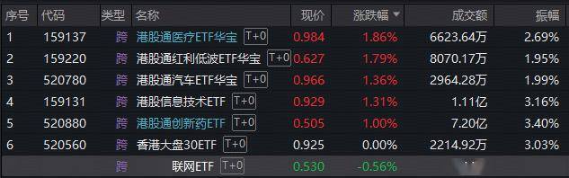港股其他主题板块普遍上涨,汽车、芯片产业链回暖,相关港股通汽车ETF华宝(520780)以及全市场首只港股信息技术ETF(159131)涨逾1.3%。医药止跌企稳,AI医疗、CXO联袂带动港股通医疗ETF华宝(159137)大涨1.86%;创新药探底回升,港股通创新药ETF(520880)收涨1%,此前两日1.38亿元资金逆行增仓。
