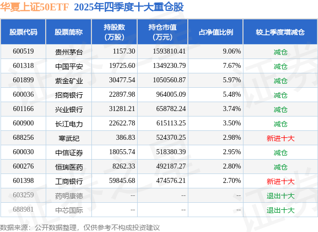 华夏上证50ETF的前十大重仓股如下: