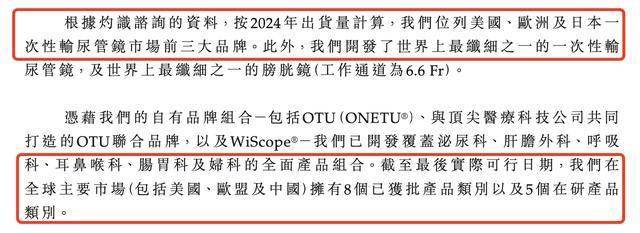 根据灼识谘询的资料,按2024年出货量计算,明智科技位列美国、欧洲及日本一次性输尿管镜市场前三大品牌。截至最后实际可行日期,公司在全球主要市场(包括美国、欧盟及中国)拥有8个已获批产品类别以及5个在研产品类别。