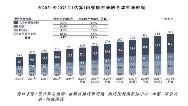 全球内窥镜市场预计将自2020年的160亿美元扩张至2032年(估算)的365亿美元,呈现稳步增长,总复合年增长率于2020年至2024年为9.5%及于2024年至2032年(估算)为5.9%。预期亚洲于早期将按复合年增长率14.5%增长,后期为9.7%,而北美洲及南美洲、欧洲中东及非洲(EMEA)以及世界其他地区的增长则较为温和。至2032年(估算),预期北美洲及南美洲仍为最大市场,达167亿美元,其次是EMEA的115亿美元。