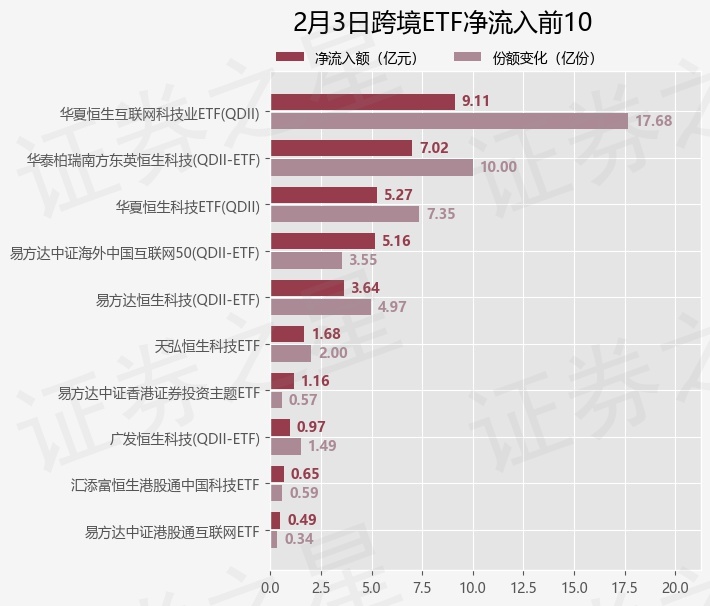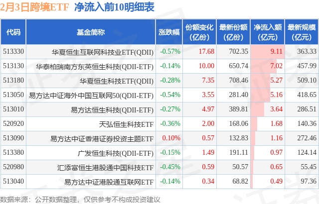 当日有44只跨境ETF基金出现资金净流入,其中净流入排首位的是华夏恒生互联网科技业ETF(QDII)(513330),份额增加了17.68亿份,净流入额为9.11亿元。