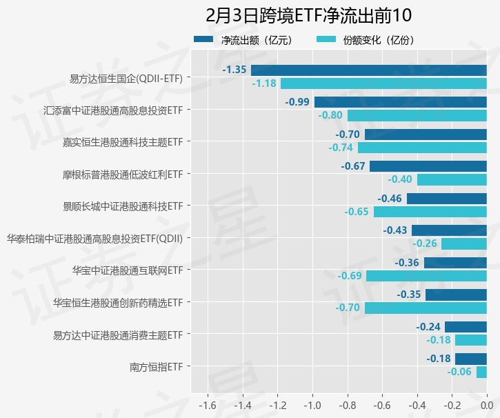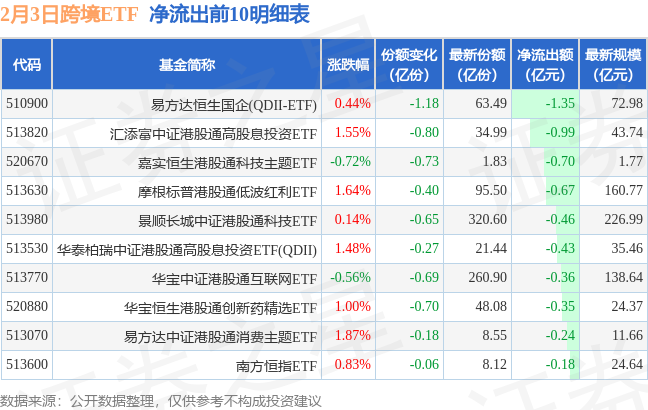 当日有30只跨境ETF基金出现资金净流出,其中净流出排首位的是易方达恒生国企(QDII-ETF)(510900),份额减少了1.18亿份,净流出额为1.35亿元。