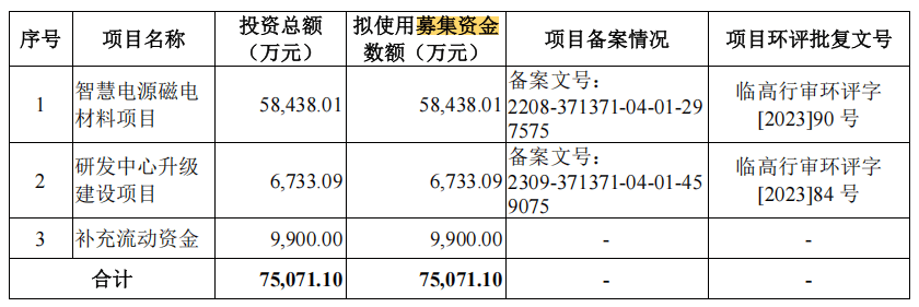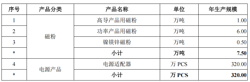 春光集团募资的智慧电源磁电材料项目选址于山东省临沂高新技术产业开发区,具体建设地点位于龙湖路南、时代路西侧地块。项目占地面积52,355.69m2,建筑面积 104,268.78m2,本项目投资总额为58,438.01万元,建设期为3年。项目建成后,将新增7.50万吨磁粉及320.00万PCS电源产品的生产能力,具体情况如下:
