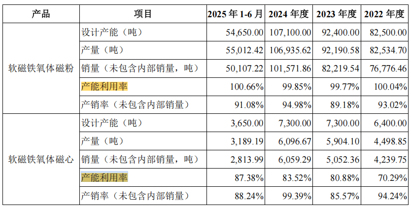 报告期内,春光集团的软磁铁氧体磁粉的产能利用率分别为100.04%。99.77%、99.85%和100.66%,软磁铁氧体磁芯的产能利用率分别为70.29%、80.88%、83.52%和87.24%。可见,该公司的软磁铁氧体磁芯的产能利用率并不高。