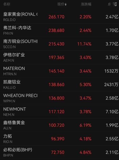 暴跌之后,国际金价反弹。COMEX黄金期货价格接近5000美元/盎司。美股有色板块走高,南方铜业涨超11%,盎格鲁黄金涨超6%,力拓、必和必拓涨超4%。