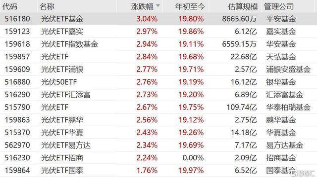 光伏股午后集体拉升,晶科能源20cm直线涨停,欧普泰涨超25%,协鑫集成天合光能涨超8%。光光伏ETF基金涨超3%,伏ETF指数基金、光伏50ETF、光伏ETF、光伏ETF嘉实、光伏ETF华夏、光伏ETF易方达、光伏ETF国泰、光伏ETF鹏华、光伏ETF招商等上涨。