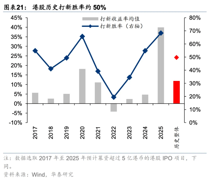 2025年,网下发行有效申购倍数的均值、中位数分别为8.7倍、4.5倍,网上发行有效申购倍数的均值、中位数分别为1654.9倍、312.9倍,网上网下打新倍数均为历史高值。2025年港股IPO破发率仅为27.6%,为2018年以来最低水平。首日收益角度看,2025年首日收益率中位数为9.6%,均值高达36.6%,均为2018年以来最高水平。