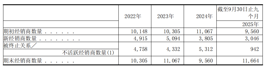 2022年,公司最大经销商占经销商总收入的5.9%,前五大经销商合计贡献11.1%。而截至2025年9月30日,最大经销商占经销商总收入已高达20.6%,前五大经销商合计占30.0%。