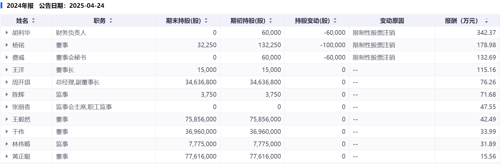 此外,董事长王洋同年薪酬为115.16万元,总经理周开琪的薪酬为76.26万元。