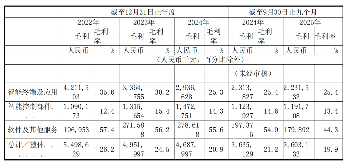 从细分业务来看,智能终端及应用业务毛利率从2022年的35.6%下降至2025年三季度的25.4%;智能控制部件毛利率则围绕13%上下波动;而软件及其他服务的毛利率也从2022年的57.4%大幅下降至2025年前三季度的44.3%。