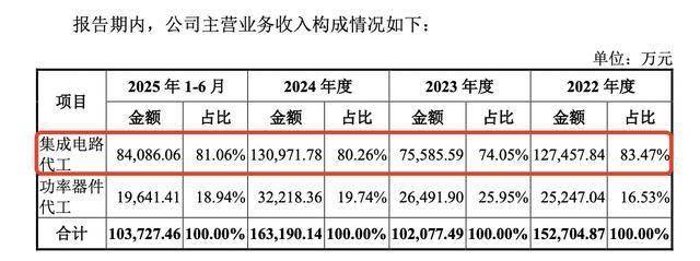 按收入构成来看,报告期内,来自集成电路代工的收入分别为12.75亿元、7.56亿元、13.1亿元、8.41亿元,占营收比重分别为83.47%、74.05%、80.26%、81.06%。