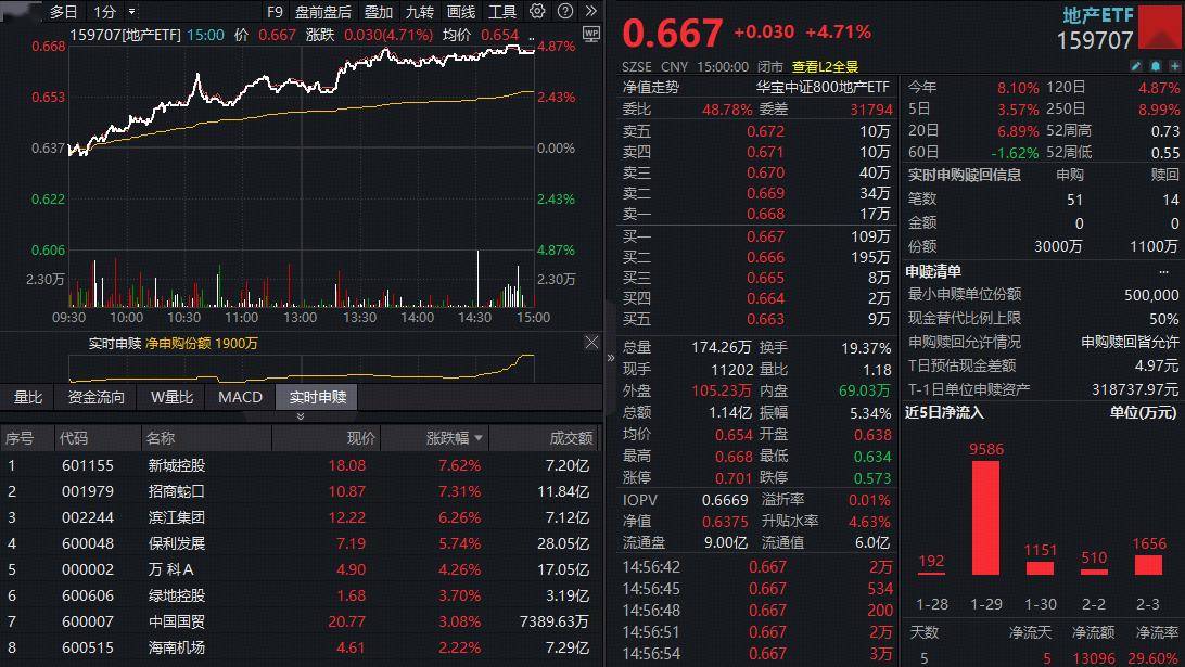 热门ETF方面,全市场唯一跟踪中证800地产指数的地产ETF(159707)全天单边走高,场内暴涨4.71%,单日涨幅居全市场地产类ETF首位,放量成交1.14亿元,资金继续加仓1900万份,此前五日已累计增持超1.3亿元。