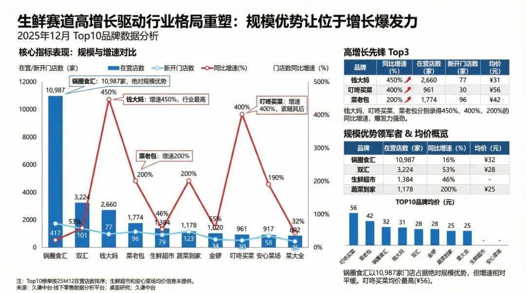 根据久谦中台·线下零售数据分析平台统计,在2025年12月的生鲜品类Top10榜单中,行业格局正在经历剧变。虽然锅圈食汇以10,987家的在营门店数占据绝对规模优势,但生鲜赛道的爆发力正向高增速选手倾斜。除了钱大妈录得450%的同比增速外,叮咚买菜和菜老包也分别以400%和200%的增幅紧随其后。