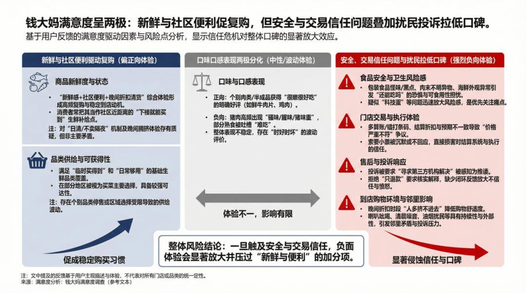 与此同时,门店交易与执行体验也面临着信任考验。负面评价指向了结算金额与促销承诺之间的脱节,多算账或折扣未生效等琐碎争议偶有发生。当原本简单的买菜交易变成了一场需要反复核对小票的心理博弈,原本累积的品牌好感度就会在琐碎的维权中被迅速消耗。