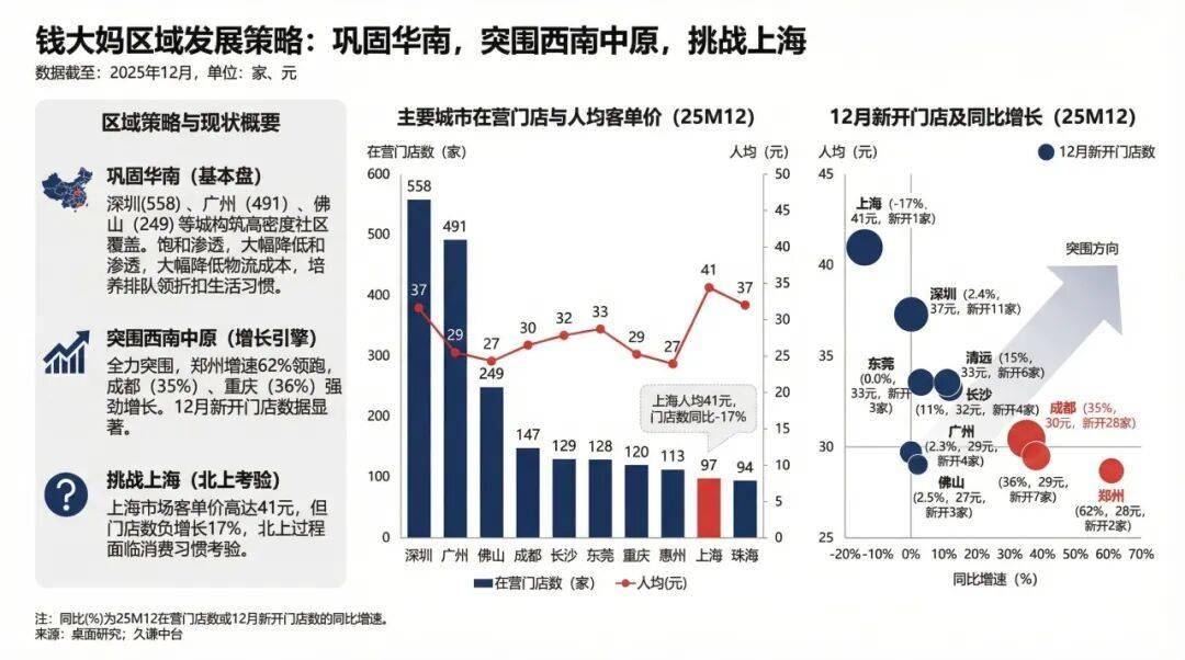 走出舒适区后的表现则呈现出明显的地域分化。12月新开门店的数据显示,钱大妈正在全力突围西南和中原,郑州以62%的增速领跑,成都和重庆也分别实现了35%和36%的强劲增长。但在客单价高达41元的上海市场,门店数却出现了17%的负增长,显现出北上过程中面临的消费习惯考验。
