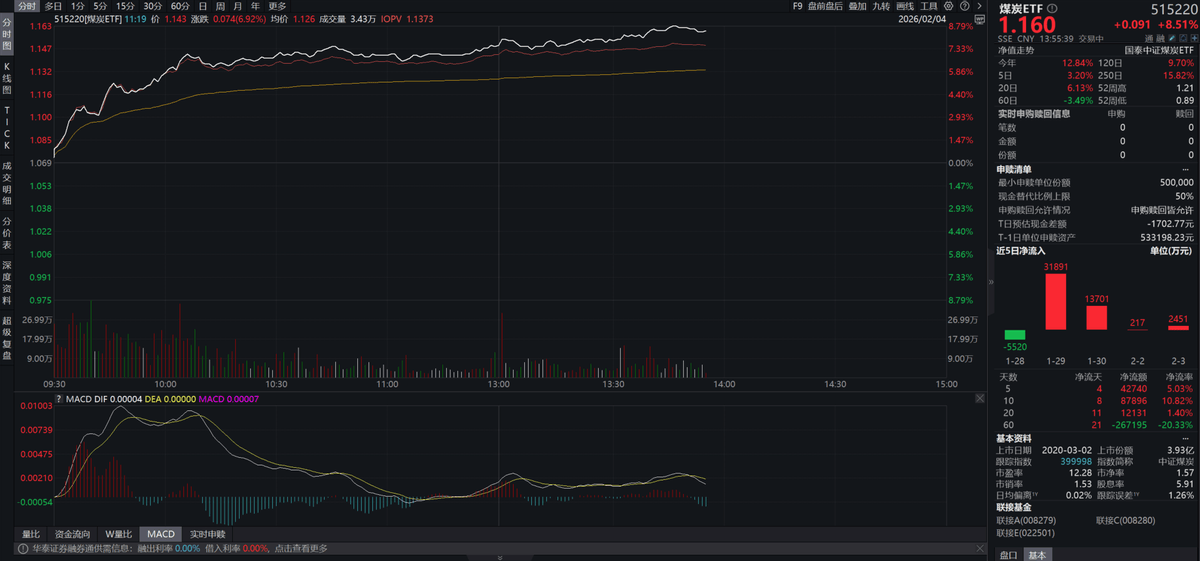 2月4日,A股震荡之中,煤炭板块火热,煤炭ETF(515220)涨超8.5%,当前规模近90亿元,资金积极布局,连续4日资金净流入近5亿元,感兴趣的投资者或可借道煤炭ETF(515220)捕捉煤炭投资机遇。