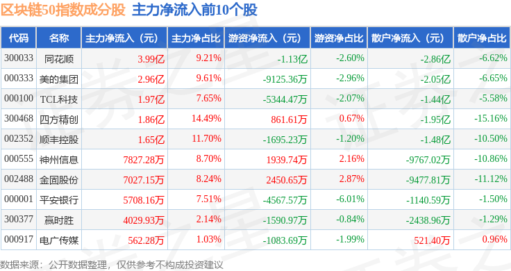资金流向方面,区块链50(399286)指数成份股当日主力资金净流出合计51.73亿元,游资资金净流入合计8.76亿元,散户资金净流入合计42.98亿元。成份股资金流向详情见下表: