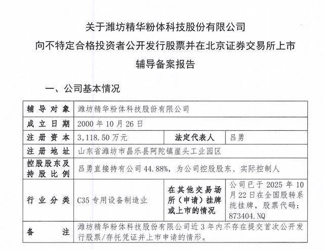 瑞财经 刘治颖 2月3日,潍坊精华粉体科技股份有限公司(以下简称:潍坊精华)在山东证监局完成IPO辅导备案,拟北交所上市,辅导机构为财达证券股份有限公司。
