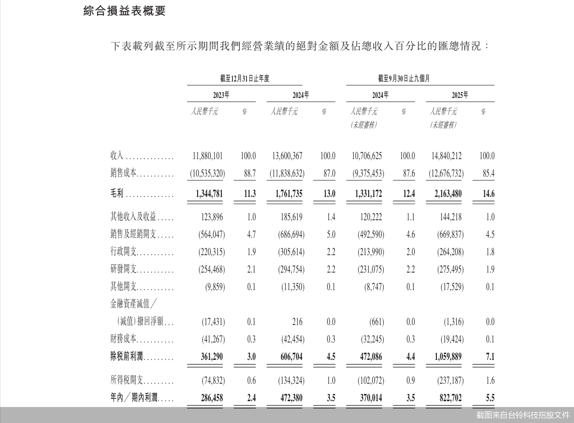 招股文件显示,2023年、2024年以及2024年前三季度、2025年前三季度,台铃科技销售及经销开支分别约为5.64亿元、6.87亿元、4.93亿元、6.7亿元,分别占各期总收入的4.7%、5%、4.6%、4.5%。