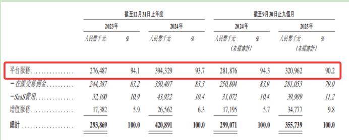 从收入占比来看,平台服务是绝对主力。2023 年到2025 年前三季度,其收入占总营收的90.2%,增值服务收入占比仅 9.8%,且长期在个位数徘徊。进一步拆解,在线交易佣金是营收的核心支柱,占比长期超 80%,2025 年前三季度仍达 79.0%。