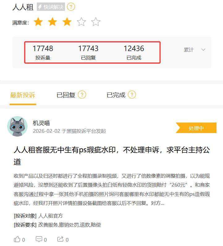 不仅如此,该平台在用户使用过程中也饱受诟病。截至2026年1月,黑猫投诉平台上与“人人租”相关的投诉超1.7万条,多集中在“霸王条款”“隐性收费”“货不对板”等问题上,部分用户甚至因逾期还款遭遇“爆通讯录”等不当催收。
