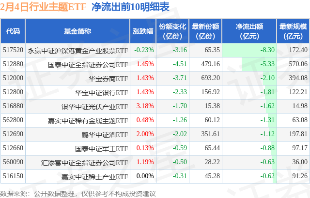 当日有128只行业主题ETF基金出现资金净流出,其中净流出排首位的是永赢中证沪深港黄金产业股票ETF(517520),份额减少了3.16亿份,净流出额为8.3亿元。